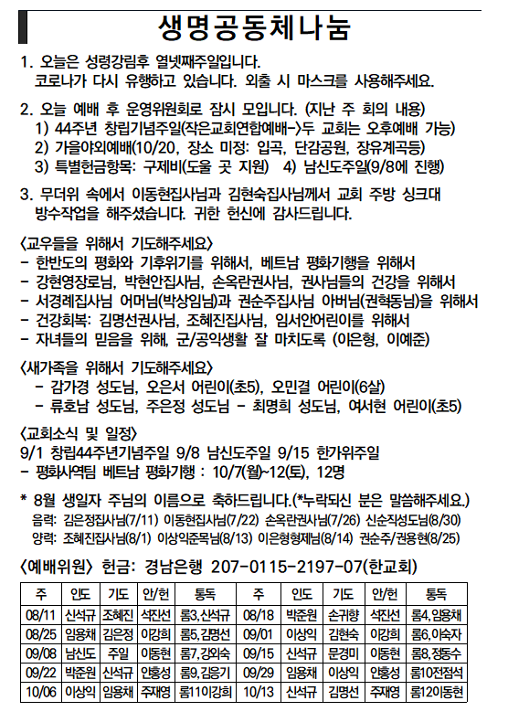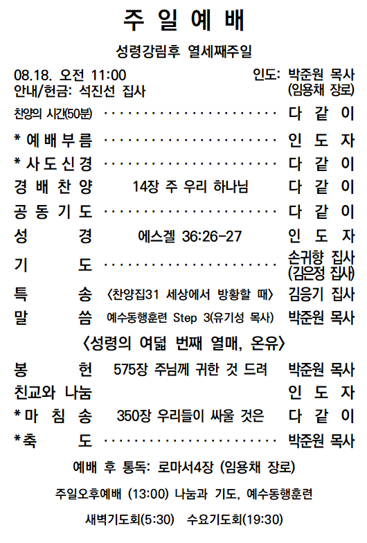 다음글 | 20240811 한교회 주일예배 | 박준원 | 2024.08.11 | 1 | 136 |