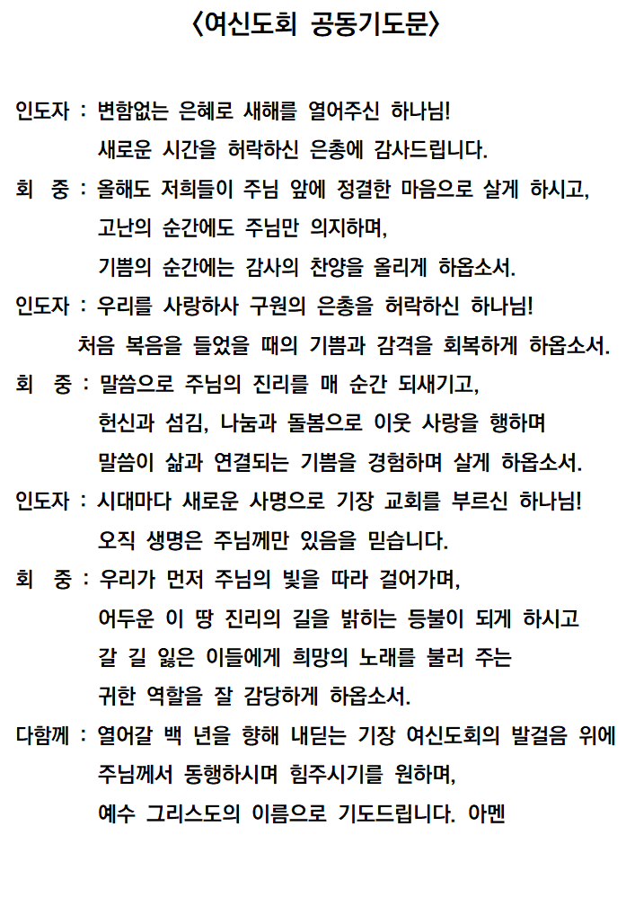 사랑의 하나님께서 우리 기장 여신도 회원들을 택하셔서 고난받는 이들과 연대하며, 창조세계 보전을 위한 생명문화운동을 이어오게 하셨습니다. 우리가 그 손길에 힘입어 살아내고 살려내는 일에 동참할 수 있었음을 감사드립니다. 우리 여신도들이 그 처음 사랑을 간직하며 새로운 역사를 만들어 가는 하나님의 사람들로 우뚝 서기를 소망합니다.