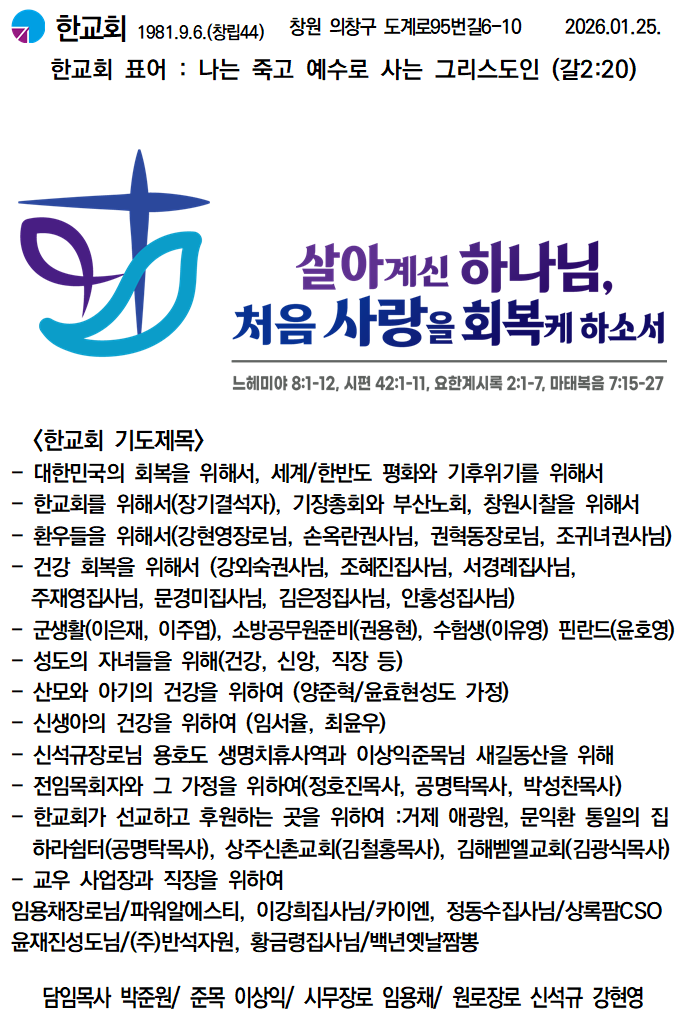 다음글 20260118 한교회 주일예배(주현절2) 박준원 2026.01.18 0 56