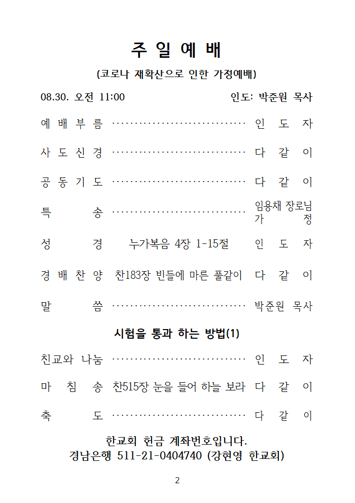 2020/08/30/ 코로나재확산으로 인한 주일가정예배(2-2)