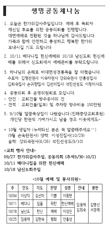 이전글 | 2020/10/04/ 창조절5 | 박준원 | 2020.10.04 | 1 | 231 |